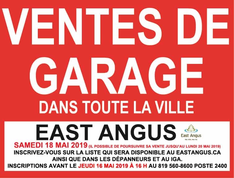 Les personnes intéressées à faire une vente de garage et à être inscrites sur la liste doivent s’inscrire au 819 560-8600 poste 2400 avant ce jeudi 16 mai 2019 à 16 h.