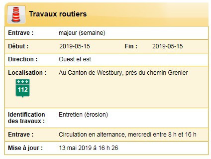 Pour information, voici un avis d’entraves concernant la route 112 au Canton de Westbury :