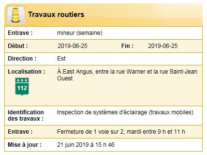 Pour information, voici un avis d’entraves concernant la route 112 à East Angus :