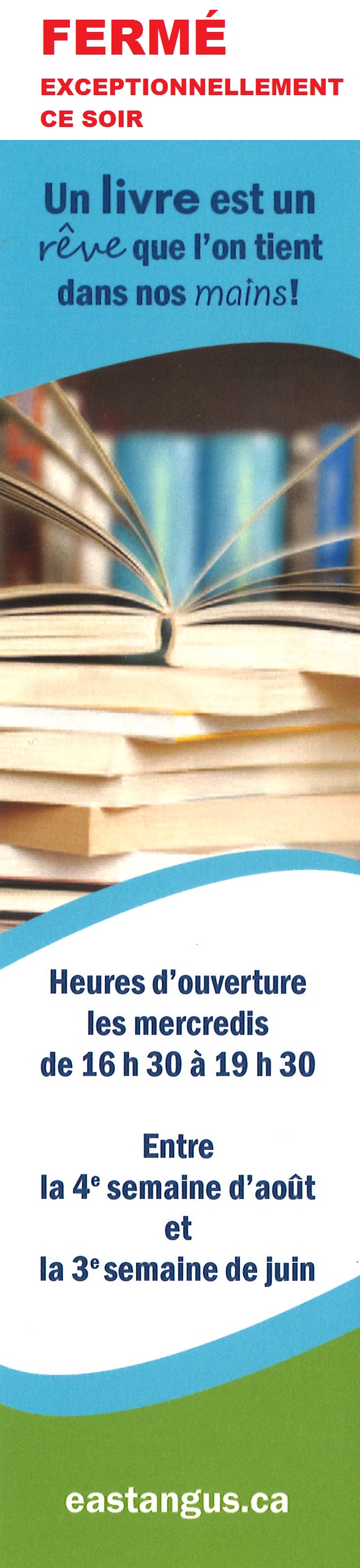 Bibliothèque fermée exceptionnellement ce mercredi 9 octobre 2019 Agrandir l'image Prenez note que la bibliothèque municipale est fermée exceptionnellement ce soir, mercredi 9 octobre 2019. East Angus2020-03-11T14:27:12-04:009 octobre 2019|Nouvelles| Partager sur les réseaux FacebookTwitterCourriel