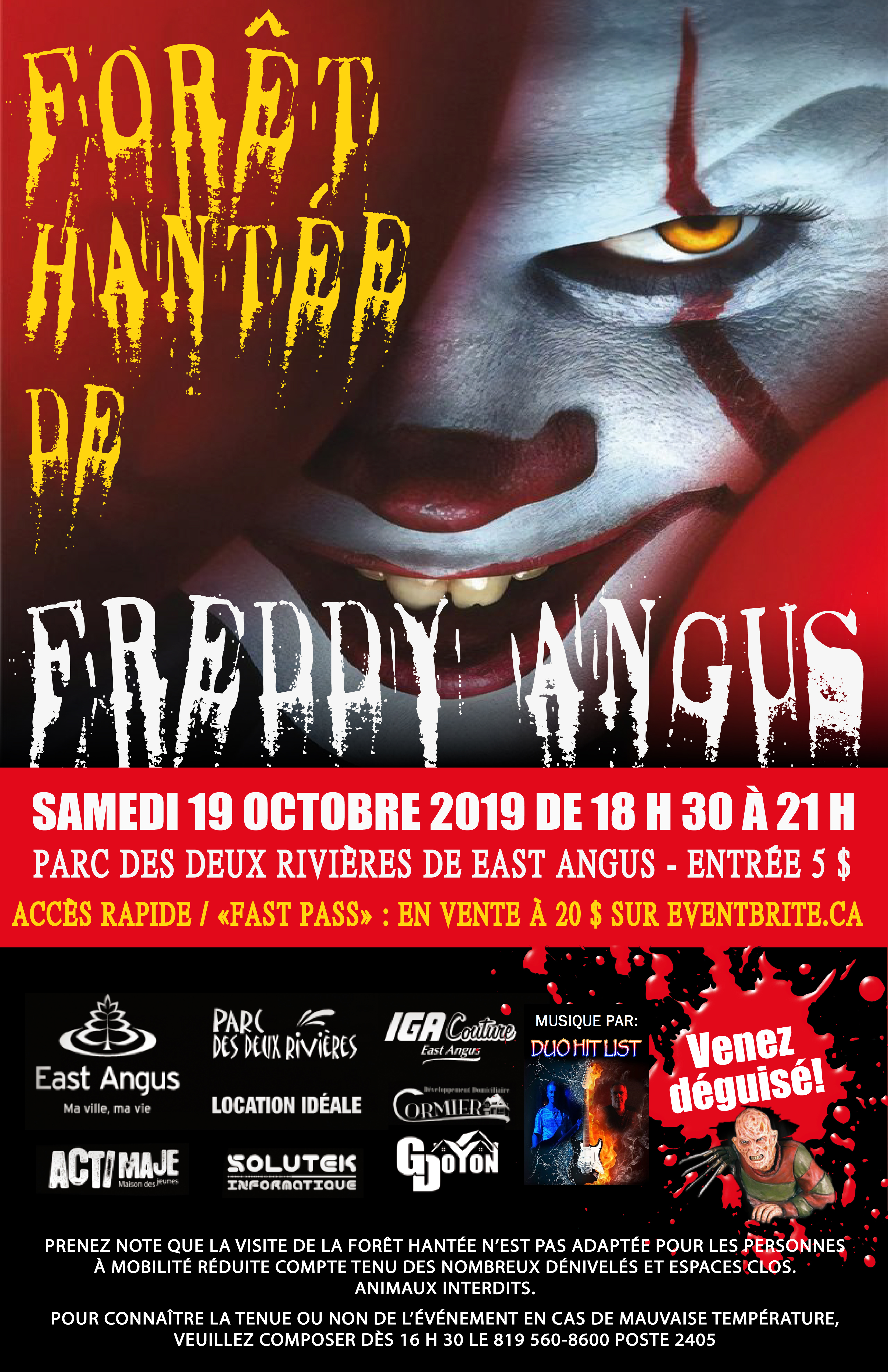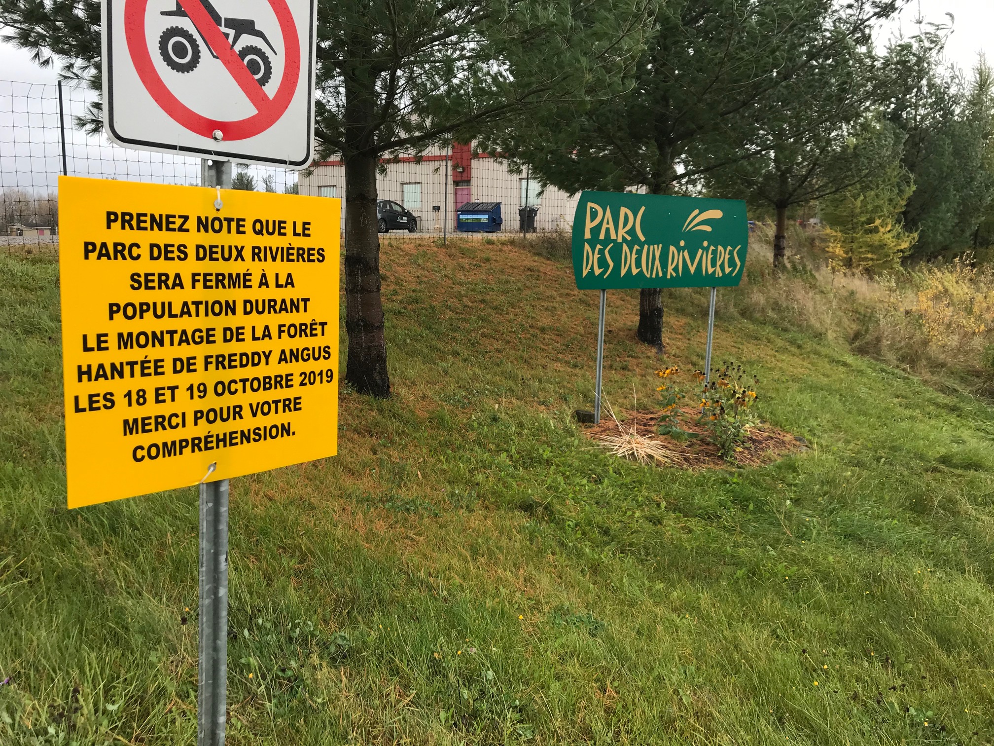 Prenez note le Parc des Deux Rivières sera fermé à la population durant le montage de la Forêt hantée de Freddy Angus le vendredi 18 octobre ainsi que le samedi 19 octobre 2019.