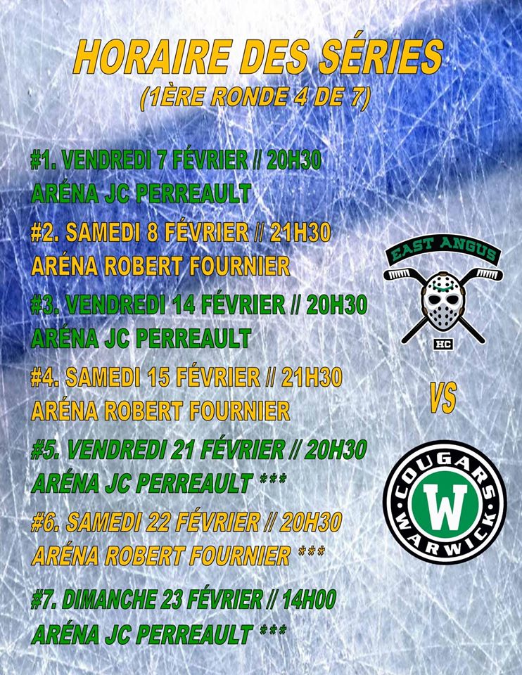 Samedi 15 février : Échauffement à 21 h – Partie à 21 h 30