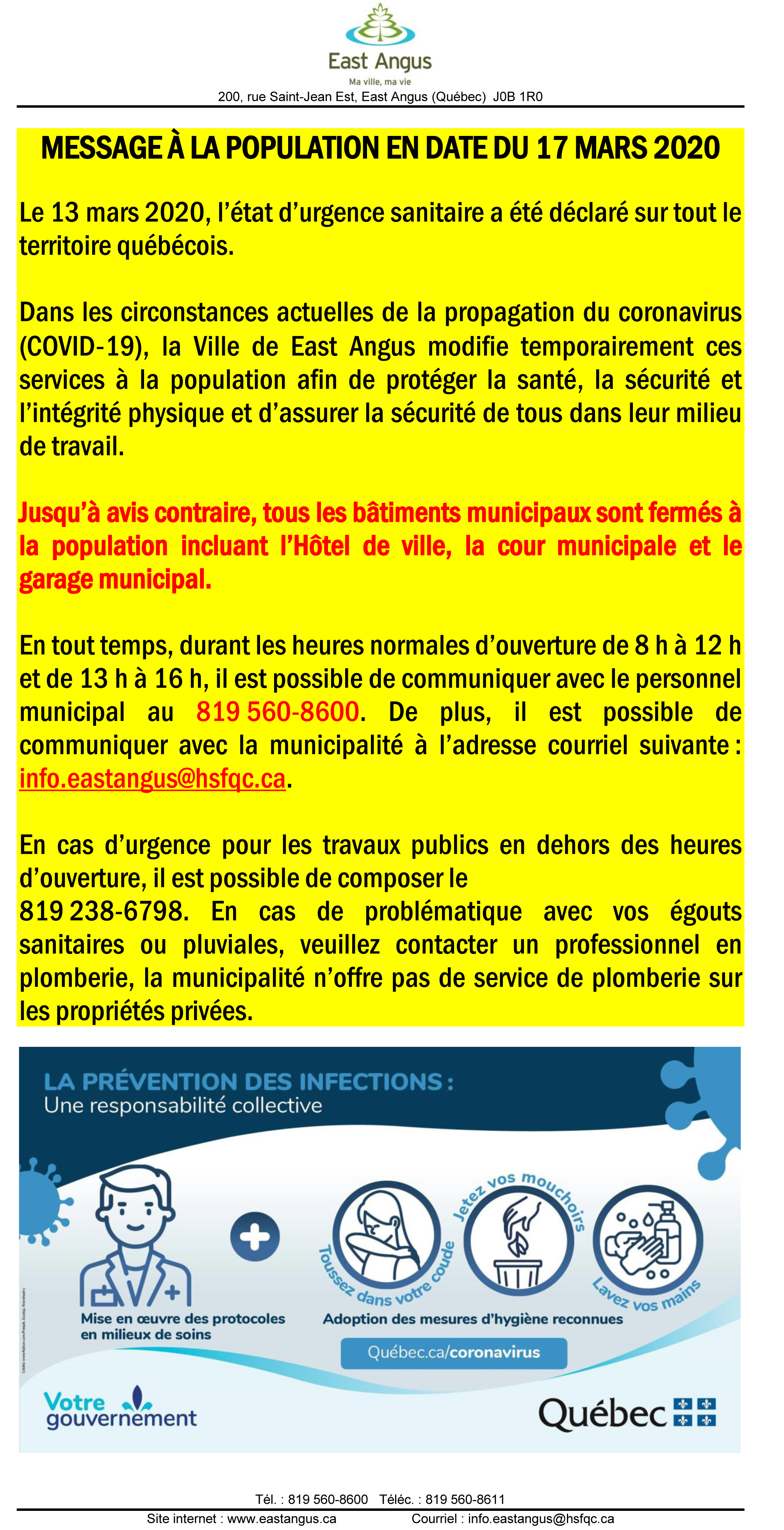 Dans les circonstances actuelles de la propagation du coronavirus (COVID‑19), la Ville de East Angus modifie temporairement ces services à la population afin de protéger la santé, la sécurité et l’intégrité physique et d’assurer la sécurité de tous dans leur milieu de travail.