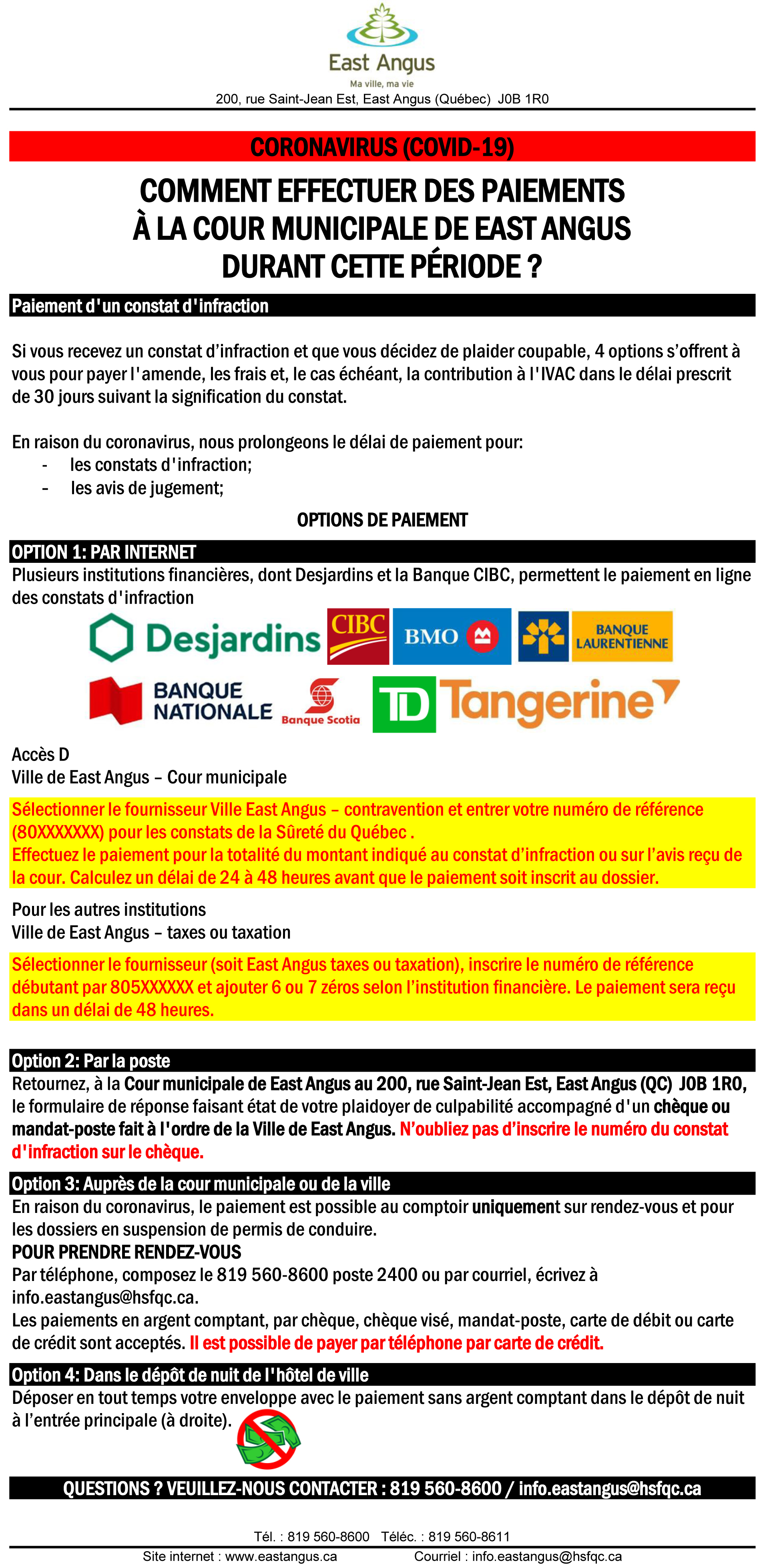 COMMENT EFFECTUER DES PAIEMENTS À LA COUR MUNICIPALE DE EAST ANGUS DURANT CETTE PÉRIODE ?
