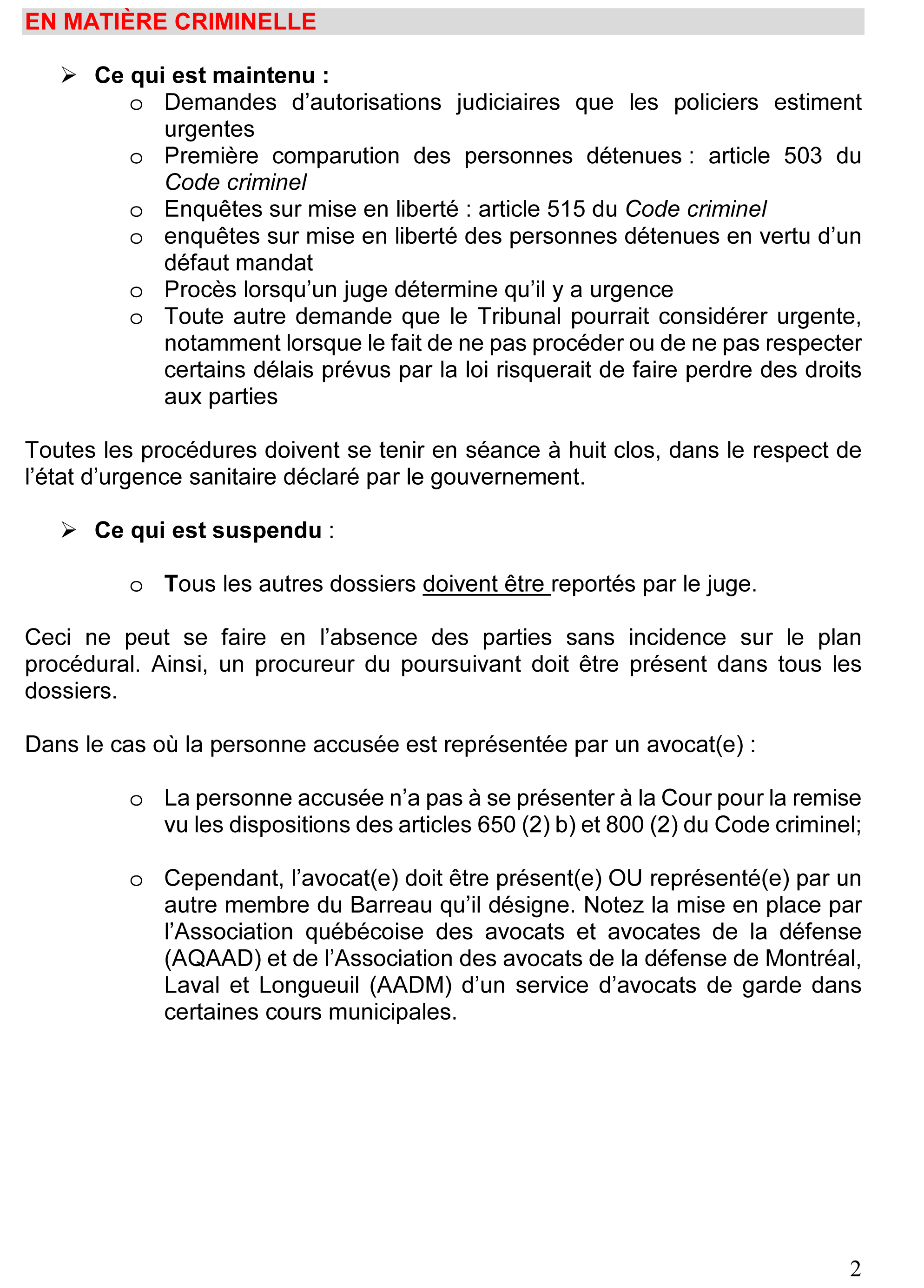 – Ce qui est maintenu : Une demande visant le sursis d’exécution de jugement (article 255 du Code de procédure pénale) est la seule procédure considérée urgente.