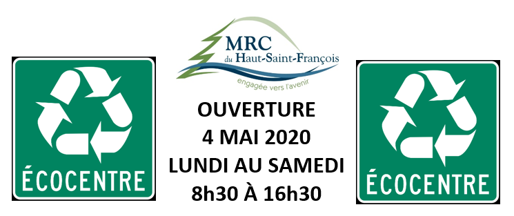 Ouverture de notre écocentre régional bientôt ! Agrandir l'image Ouverture de notre écocentre régional le lundi 4 mai ! East Angus2020-04-17T12:00:31-04:0017 avril 2020|Nouvelles| Partager sur les réseaux FacebookTwitterCourriel