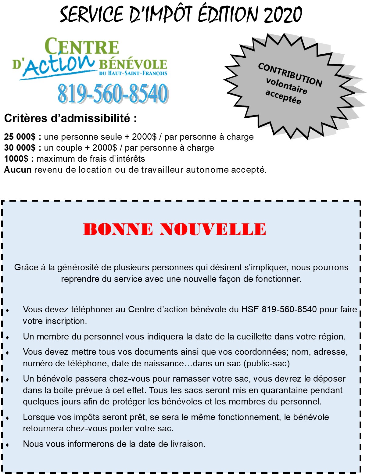 Service d'impôt disponible à nouveau ! Agrandir l'image Service d’impôt édition 2020 Le service pourra reprendre avec une nouvelle façon de fonctionner. Pour vous inscrire ou plus d’informations : 819 560-8540 East Angus2020-04-15T14:16:30-04:0015 avril 2020|Nouvelles| Partager sur les réseaux FacebookTwitterCourriel