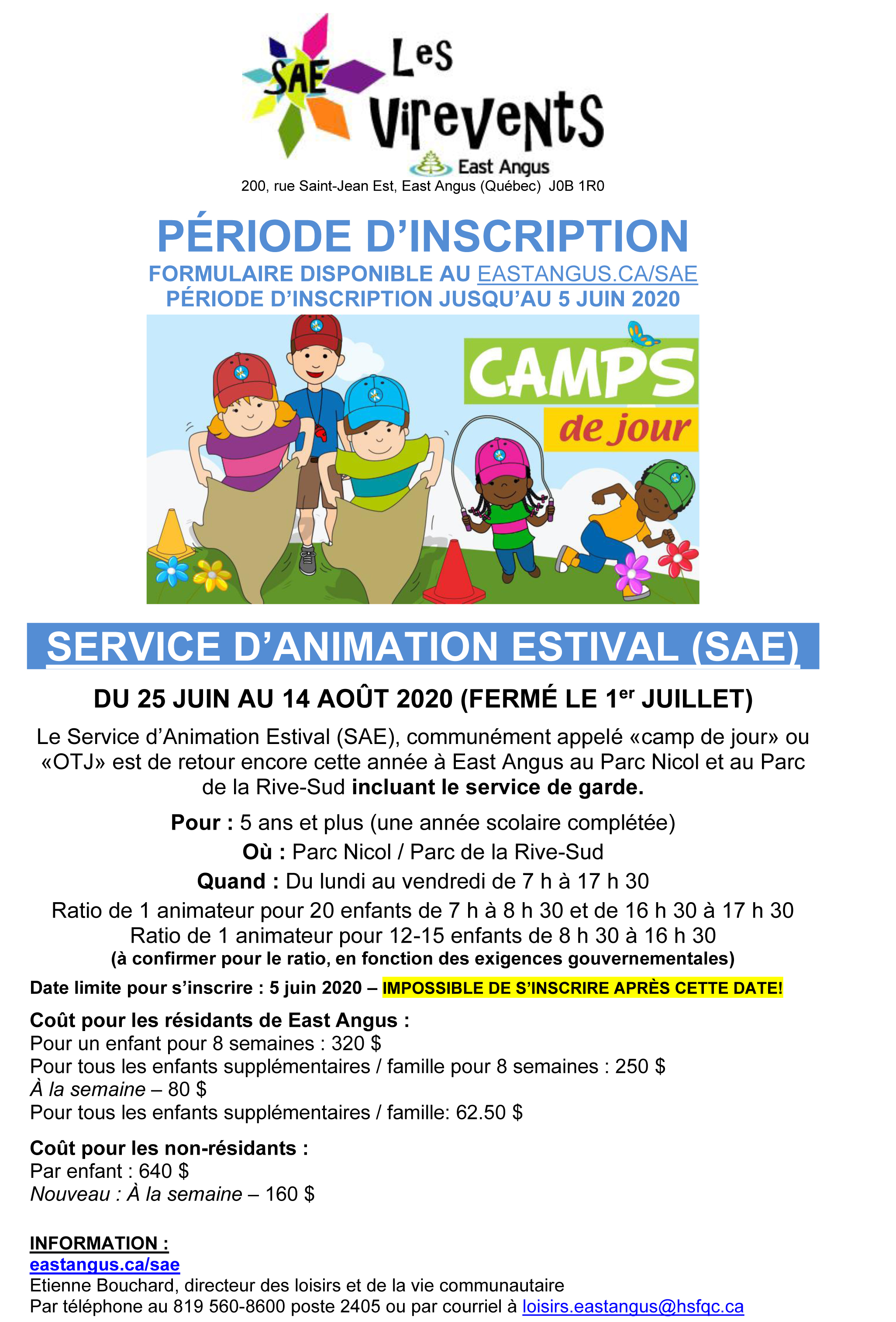 Nous allons avoir une meilleure idée de la programmation et des activités proposées dans les prochaines semaines. Pour le moment, nous ouvrons les inscriptions pour confirmer aux citoyens qu’il va y avoir un service d’animation cet été et pour mieux adapter notre programmation (nb d’inscriptions, lieux nécessaires, nombre d’animateurs, matériel nécessaire, etc).