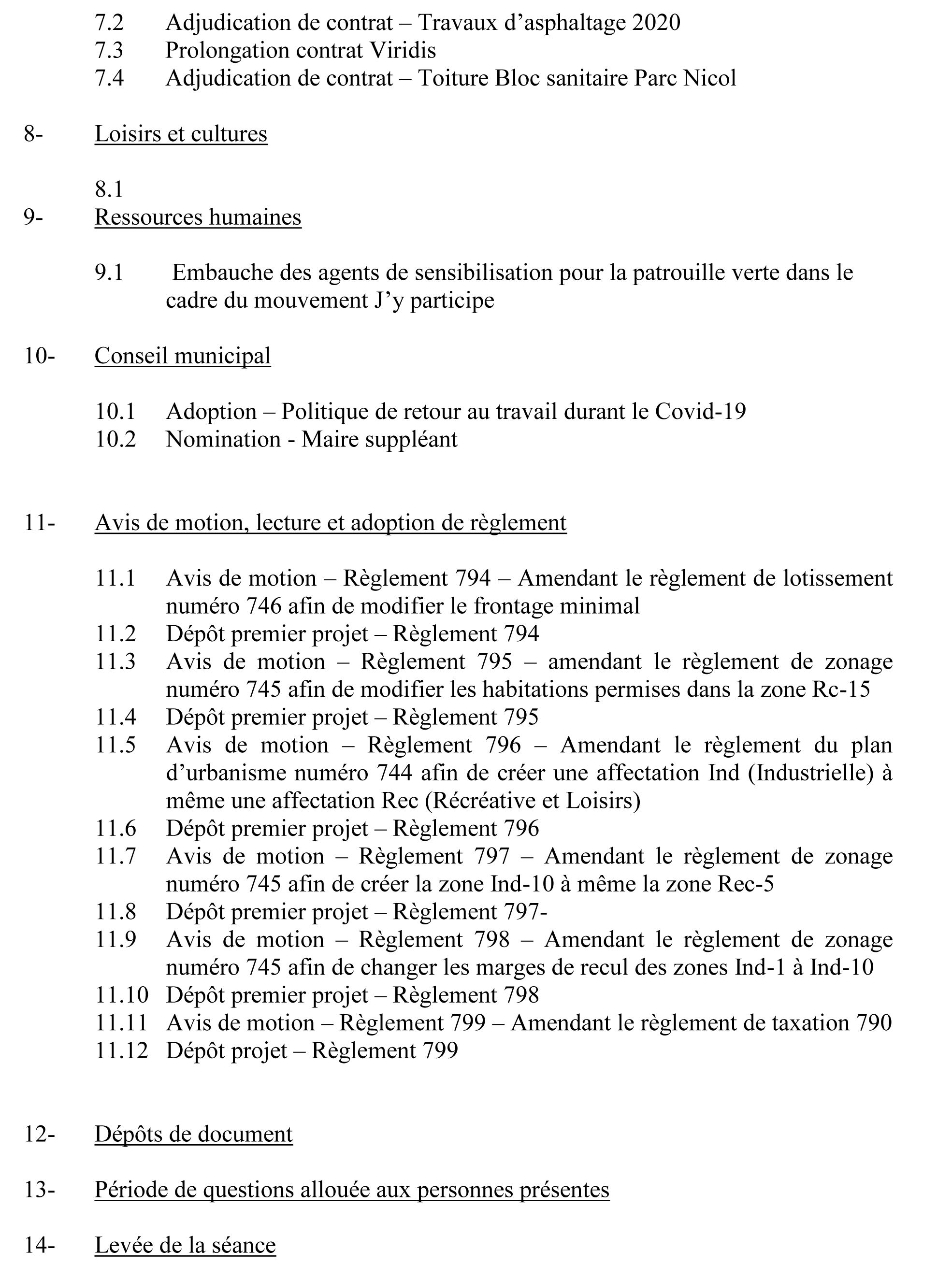Voici l’ordre du jour de la séance régulière du conseil municipal du 1er juin 2020
