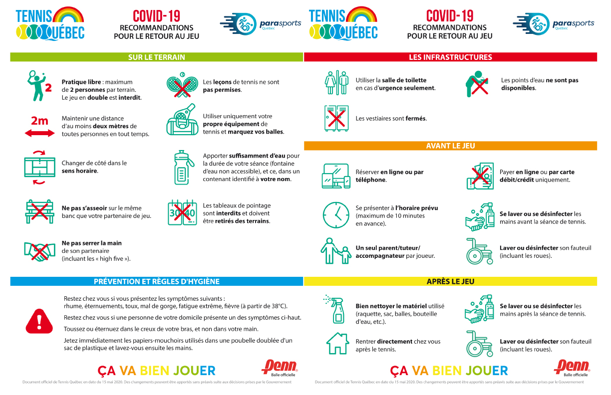 Dans le cadre des directives gouvernementales, l’ouverture des terrains de tennis se fera à compter de 10 h ce mercredi 20 mai 2020. La population doit respecter les consignes en vigueur :