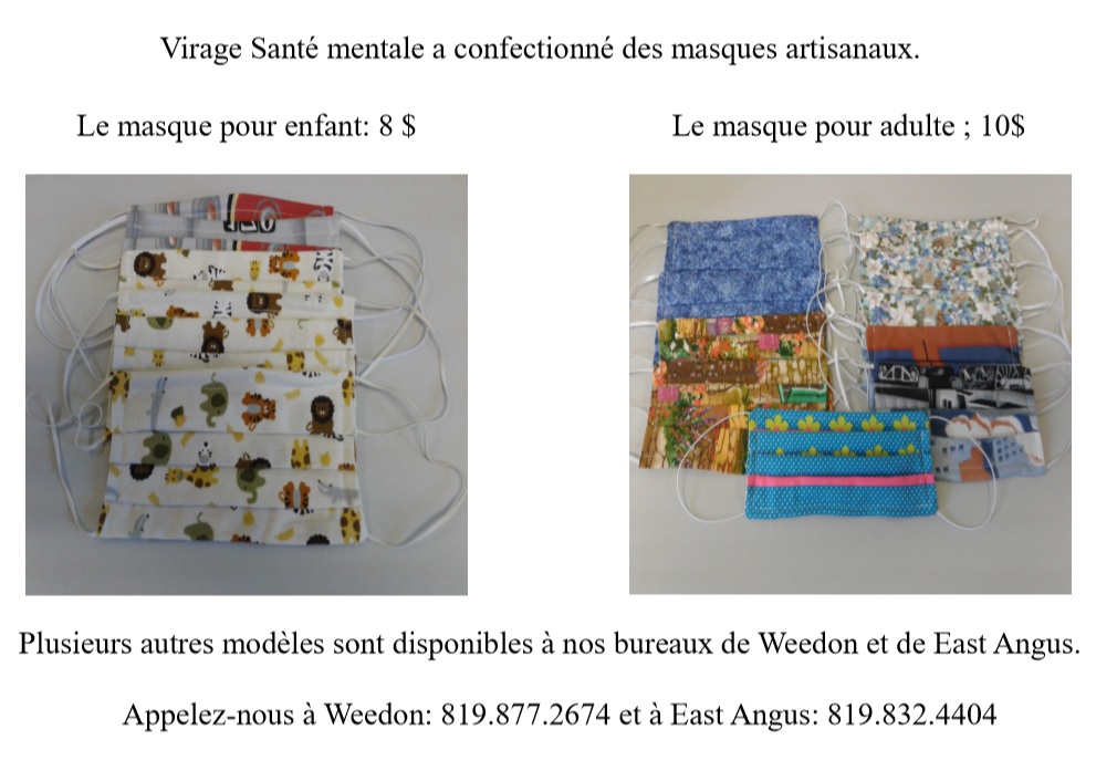 Virage Santé Mentale a confectionné des masques artisanaux Agrandir l'image Informations au 819 877-2674 ou 819 832-4404 East Angus2020-05-26T10:22:03-04:0026 mai 2020|Nouvelles| Partager sur les réseaux FacebookTwitterCourriel