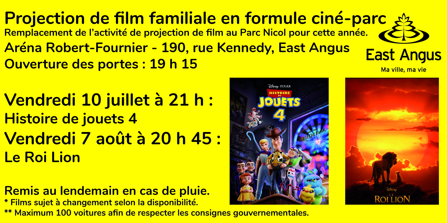 Histoire de jouets 4 – Vendredi 10 juillet 21 h à l'Aréna Agrandir l'image Ciné-parc Film : Histoire de jouets 4 Rappel – Activité familiale gratuite ce soir vendredi 10 juillet dès 21 h Ouverture des portes à 19 h 15 Aréna Robert-Fournier East Angus2020-07-10T11:46:08-04:0010 juillet 2020|Nouvelles| Partager sur les réseaux FacebookTwitterCourriel