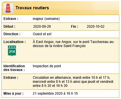 Avis d’entraves concernant la route 214 (rue Angus) à East Angus