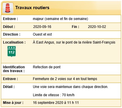 Veuillez noter que les travaux sont prolongés jusqu’au 2 octobre et qu’il y aura fermeture de 2 voies sur 4 à compter d’aujourd’hui, le 16 septembre, et ce, jusqu’à la fin des travaux.