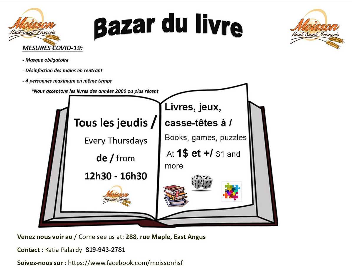 15 octobre 2020 - 12 h 30 à 16 h 30 Recurring Bazar de livres Centre culturel de East Angus 288, rue Maple,East Angus,Québec,Canada