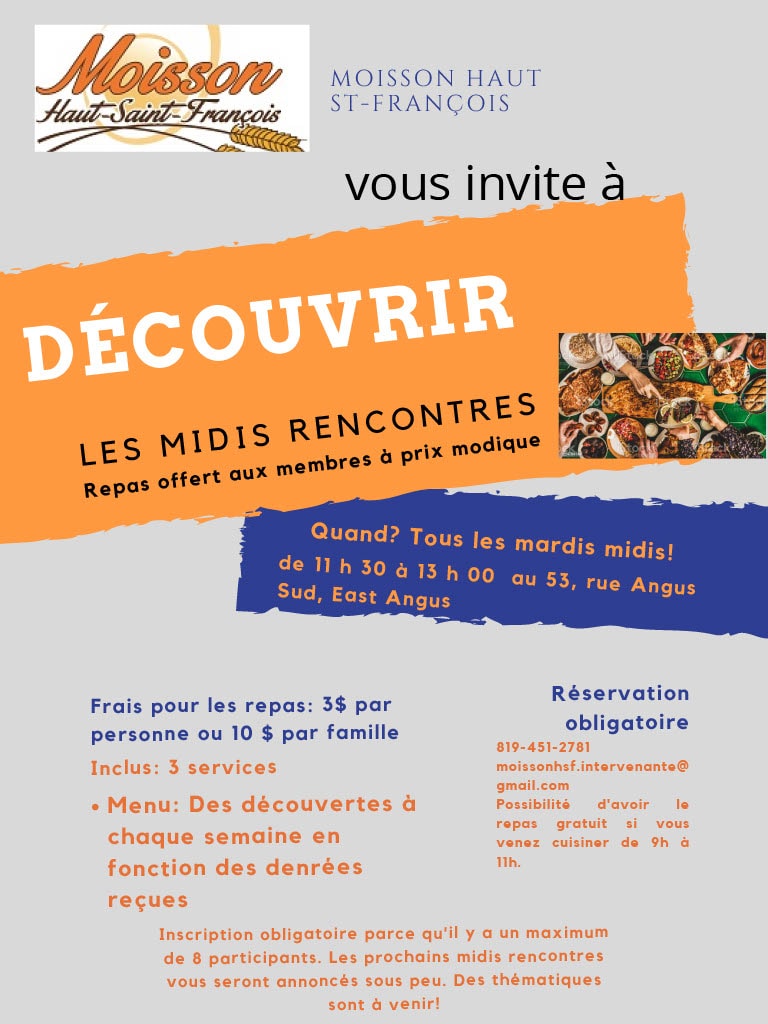 17 août 2021 - 11 h 30 à 13 h 00 Recurring Midis rencontres – Moisson Haut-Saint-François Moisson Haut-Saint-François 53, rue Angus Sud,East Angus,Québec,Canada